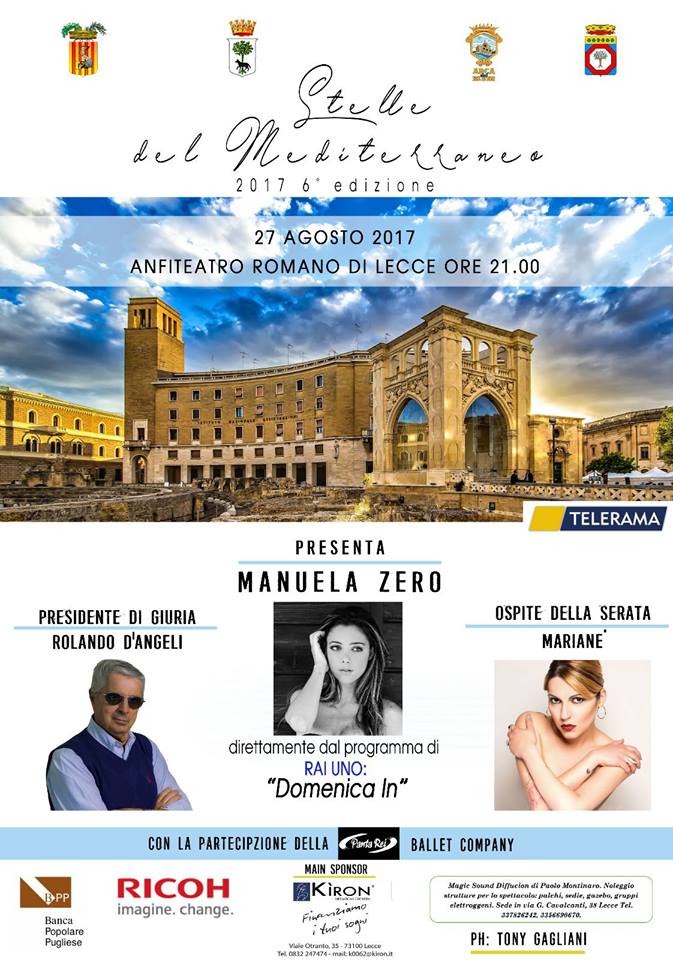La finalissima Festival Stelle del Mediterraneo, si terrà giorno 27 Agosto 2017 ore 21.00, nella Cetralissima Piazza Sant'Oronzo e precisamente nello storico ANFITEATRO ROMANO di Lecce.
